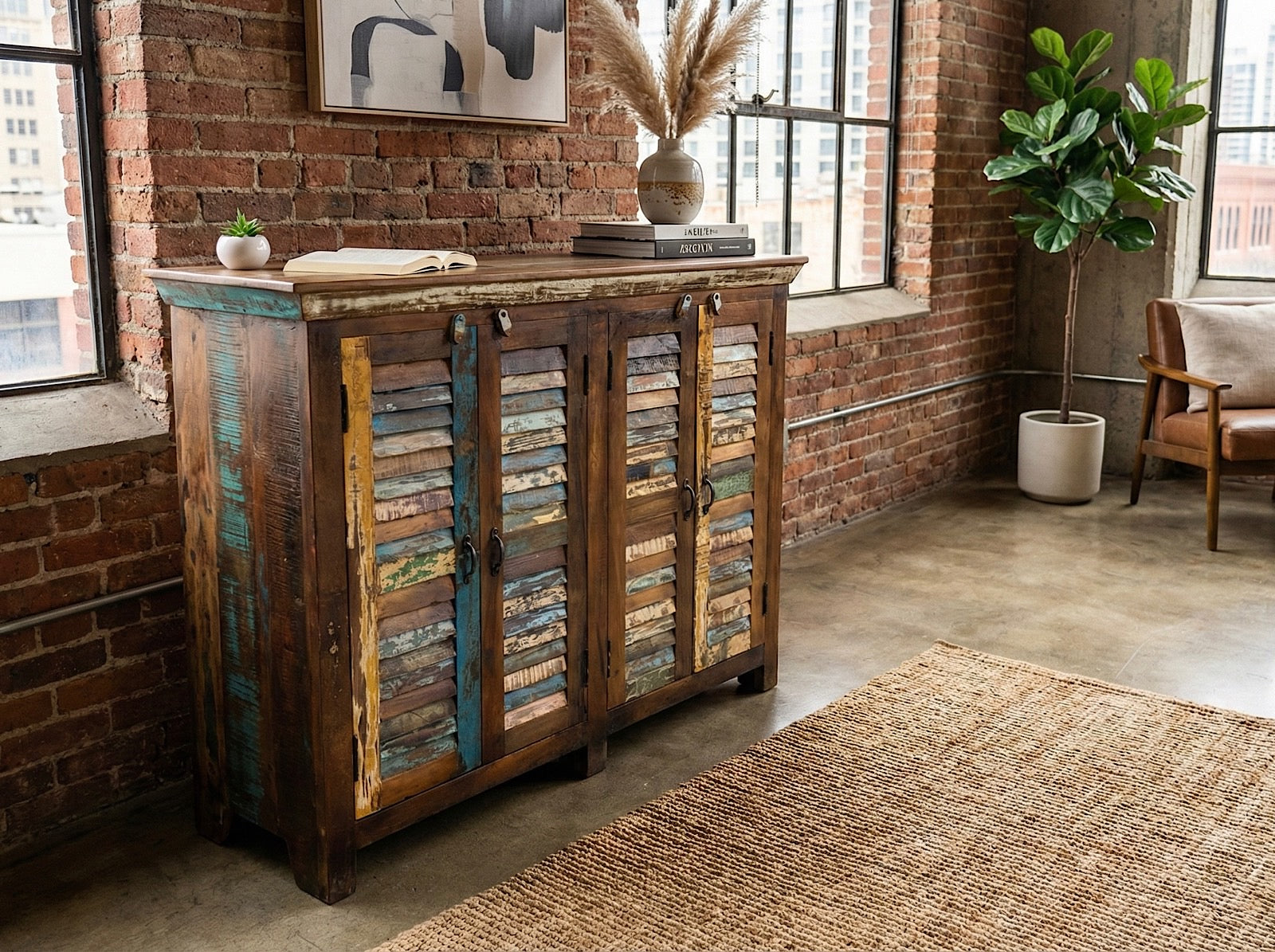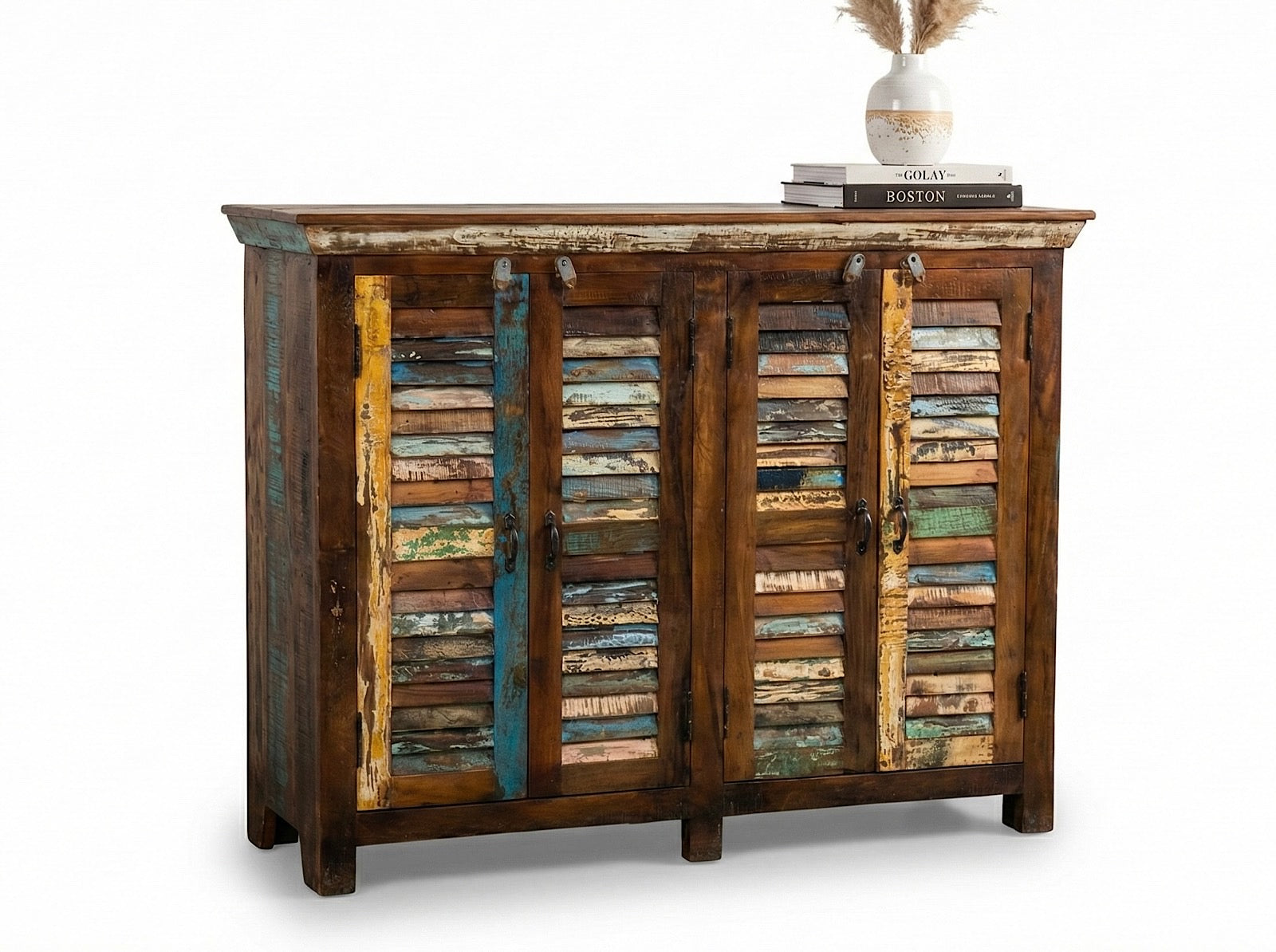 Le buffet Billy en bois recyclé apporte une touche élégante et écologique à votre intérieur. Ce meuble spacieux avec quatre portes fermées et des tablettes intérieures est idéal pour le rangement tout en ajoutant du charme à votre espace.