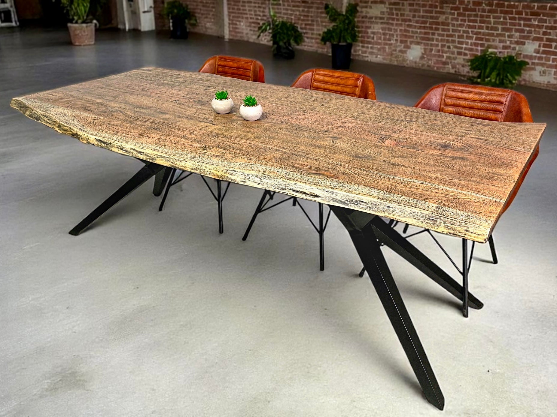 Cette table à dîner exclusive, avec son bord naturel préservé et sa finition raffinée, est la pièce maîtresse idéale pour les repas inoubliables. Finition dark wash, édition limitée, pattes en métal noires U, X OU W.