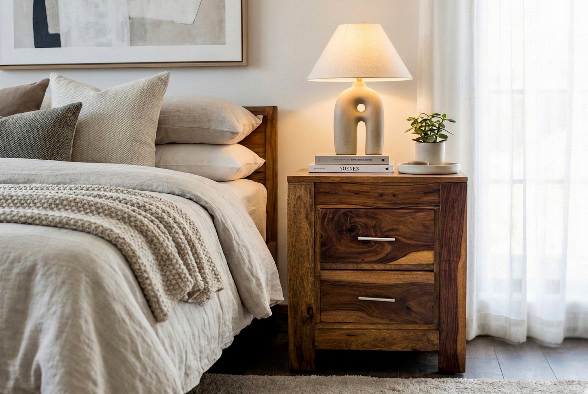 Cette table de nuit en bois de rose massif, disponible en trois couleurs (naturelle, olive et brun clair), offre une touche élégante et naturelle à votre chambre. Parfaite pour un rangement pratique à côté de votre lit.
