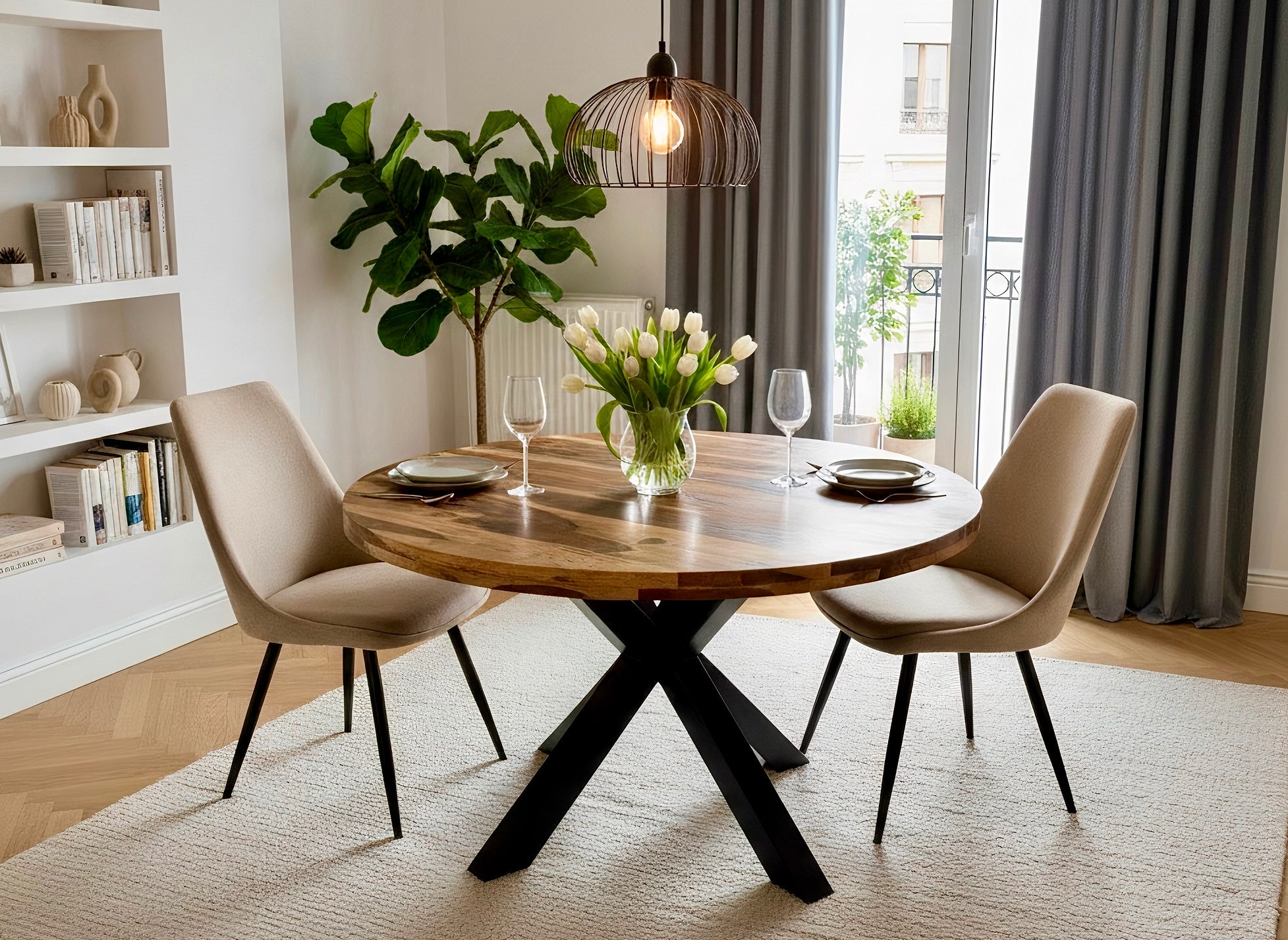 Made from premium rosewood, each table is unique, highlighting the natural beauty and richness of the wood grain. Its round shape creates a warm and welcoming atmosphere, ideal for friendly meals or informal gatherings. It is available in 4 sizes and 3 colors