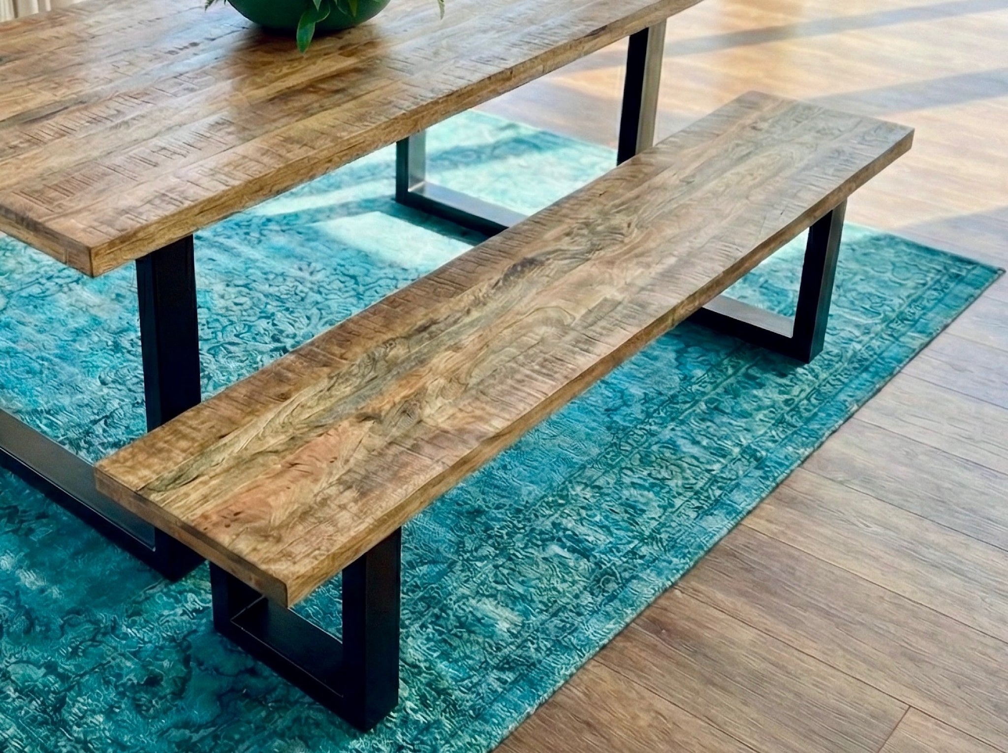 - Matériaux: Bois de manguier laminé, pattes robustes en métal